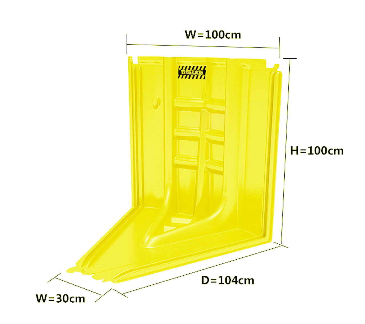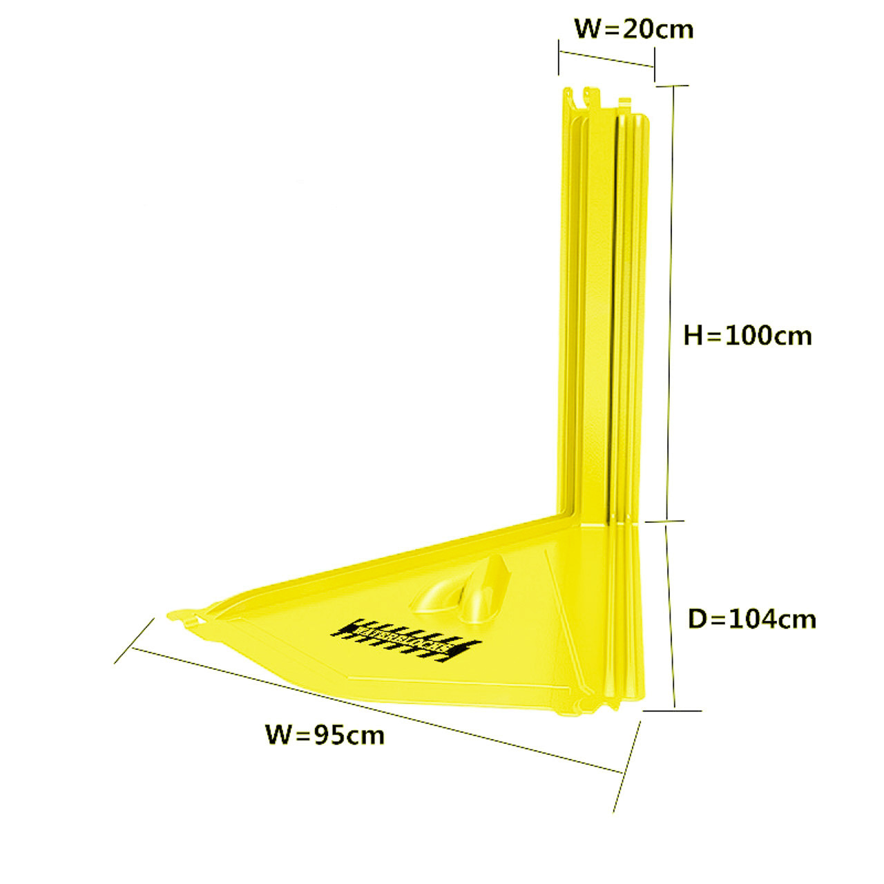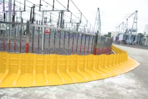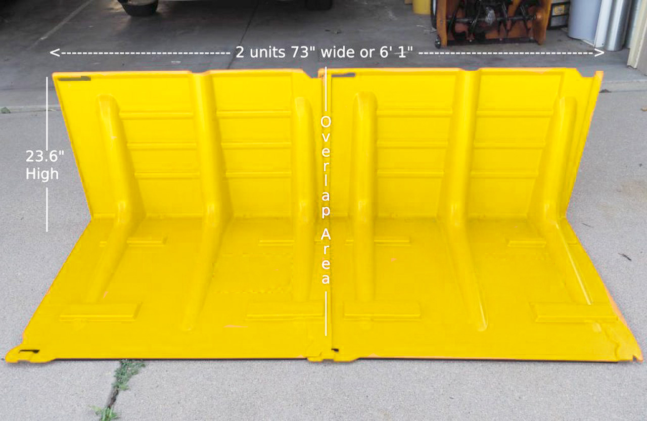 The R/T 40 is the largest of the rough terrain barriers with a wall height of almost 40″ and weighing just under 32 lbs each. These are best installed with 2 people. Every four (4) units cover about 13 feet. Each unit is 105W x 100H x102D in centimeters and weighs 14.5 kilograms. They are 4.8mm thick.